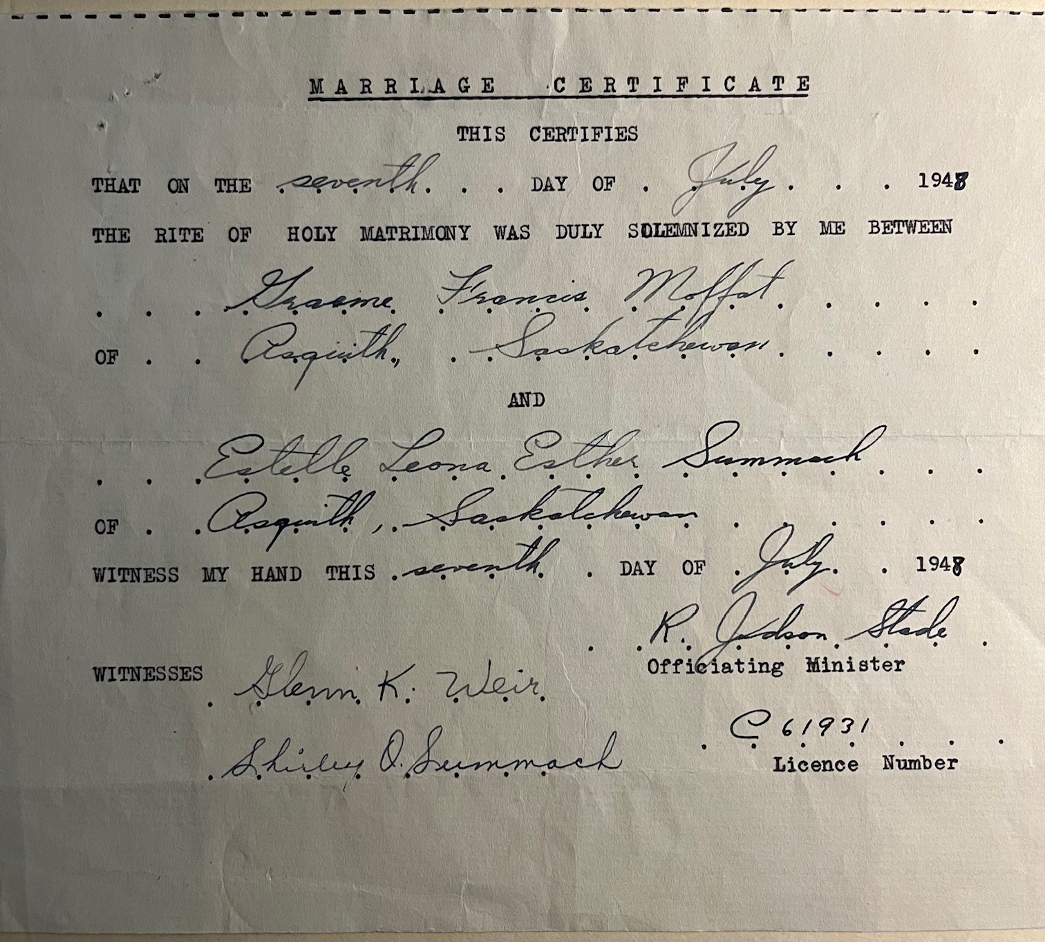 Original marriage certificate issue by Rev. R. Judson Stade who officiated at the wedding of Greme Moffat and Estelle Summach, 7 Jul 1948