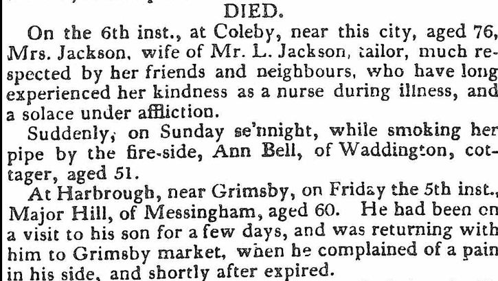 ...At Harbrough, near Grimsby, on Friday the 5th inst., Major Hill. of Messingham, aged 60. He had been on a visit to his son for a few days, and was returning with him to Grimsby market, when he complained of a pain in his side, and shortly after expired...9