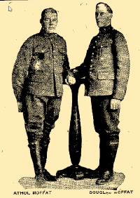 Corp. Athol Moffat, who died at Ninette sanatorium last month was the last of his family. Early in the war he enlisted in the Anglo-Indian army in German East Africa where he served 16 months, when he was disabled and sent to England. After recovering from his wounds he was sent to France, where he served until he was returned to Canada on account of ill health, in August 1918. His brother Douglas was wounded at Courcelette and taken prisoner, dying in a German prison camp. His father, William Moffat, formerly secretary of the Grain Growers' association, died in Winnipeg 14 months ago. Both the boys were born in Winnipeg and educated here. Douglas enlisted early in the war with the 90th Rifles.
