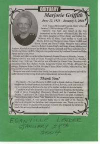 June 22, 1925 - January 3, 2003. Hereinafter cited as Eganville Leader. - [S269] Jean nee Yourth Panke, "Panke, Jean (Yourth) email," e-mail message from email address withheld for privacy (Ottawa, Ontario) to Rick Moffat, Saturday, April 08, 2006 7:47 AM; Re: Obit - Marjorie Griffith. Hereinafter cited as "Panke, Jean (Yourth) email."