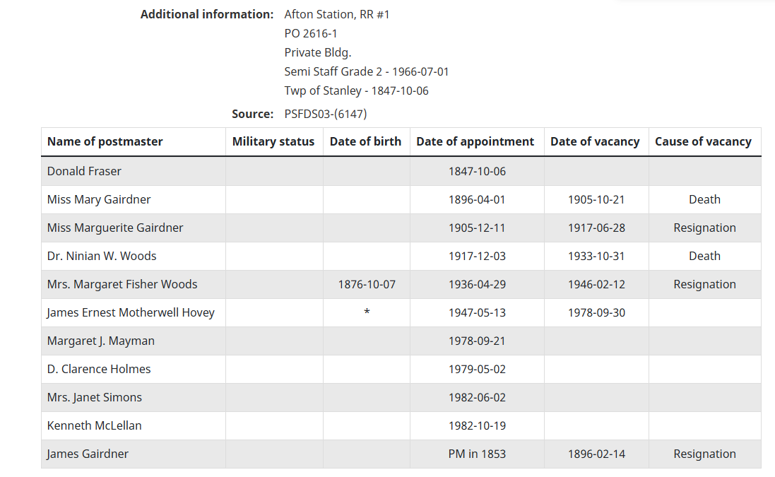 Mary Gardiner appeared on the 1891 Canadian Census of Bayfield, Stanley Twp., Huron County, Ontario in the household of her parents, James and Mary Gardiner.5 James Gairdner was postmaster of Bayfield from 1853 to 14 Feb 1896, when he resigned. He was followed by his daughters: Mary Gairdiner (01 Apr 1896 to 21 Oct 1905) until her death and Margerette Gairdner (11 Nov 1905 to 28 June 1917) when she resigned.7