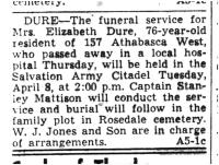 Elizabeth Dure died on 4 April 1952, in a local hospital, Moose Jaw, Saskatchewan, Canada. Note that the obituary says she died on Thursday, which was Apr. 3 in 1952.9,10 She was buried on 8 April 1952 at Rosedale Cemetery, Moose Jaw, Saskatchewan, Canada.10,9